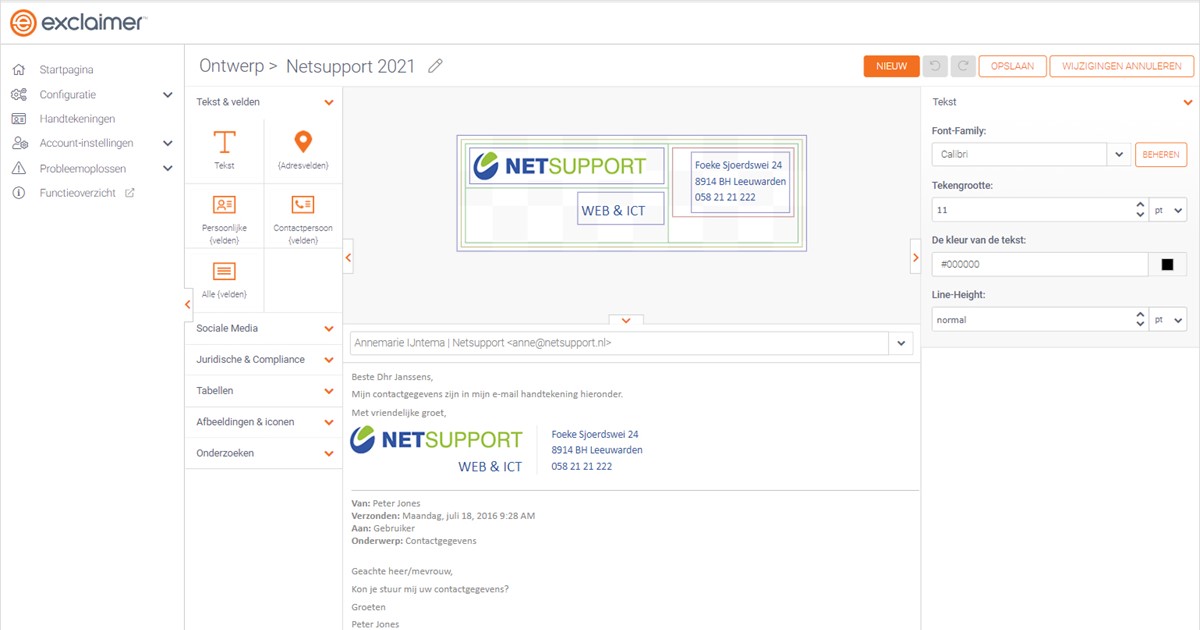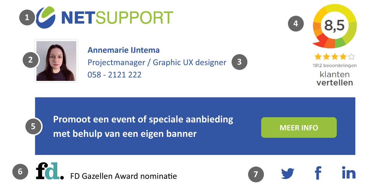 Netsupport kan een passende e-mailhandtekening voor jou ontwerpen. Dit kunnen meerdere varianten zijn, of bijvoorbeeld alleen een banner. Ook kunnen wij helpen met je ontwerp correct in te richten in Exclaimer.