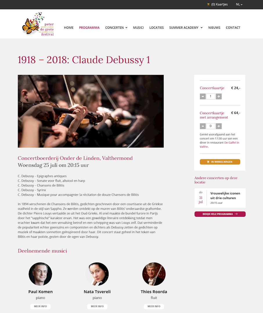 Het programma overzicht kan volledig door de festivalcoördinator worden bepaald via het website beheersysteem (CMS) van Umbraco. Zoals de concertnaam, locatie, datum, prijs, status, arrangement en musici die het optreden verzorgen. Vanuit het overzicht kan een bezoeker direct kaarten reserveren of doorklikken naar een concertpagina voor meer informatie.